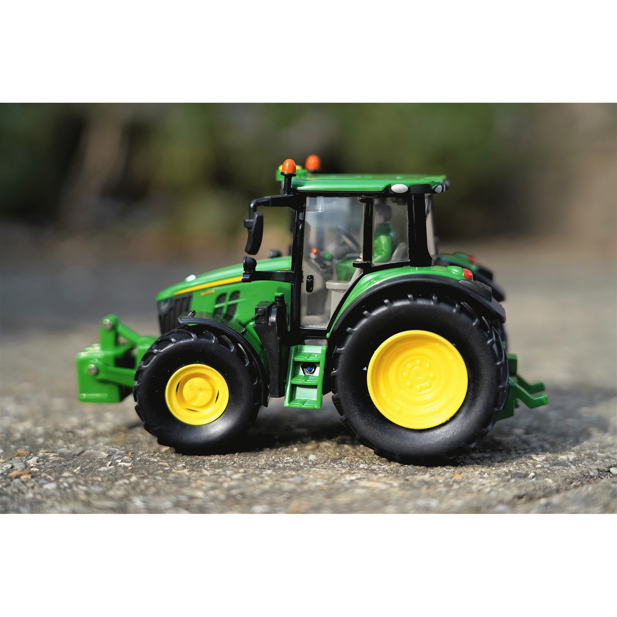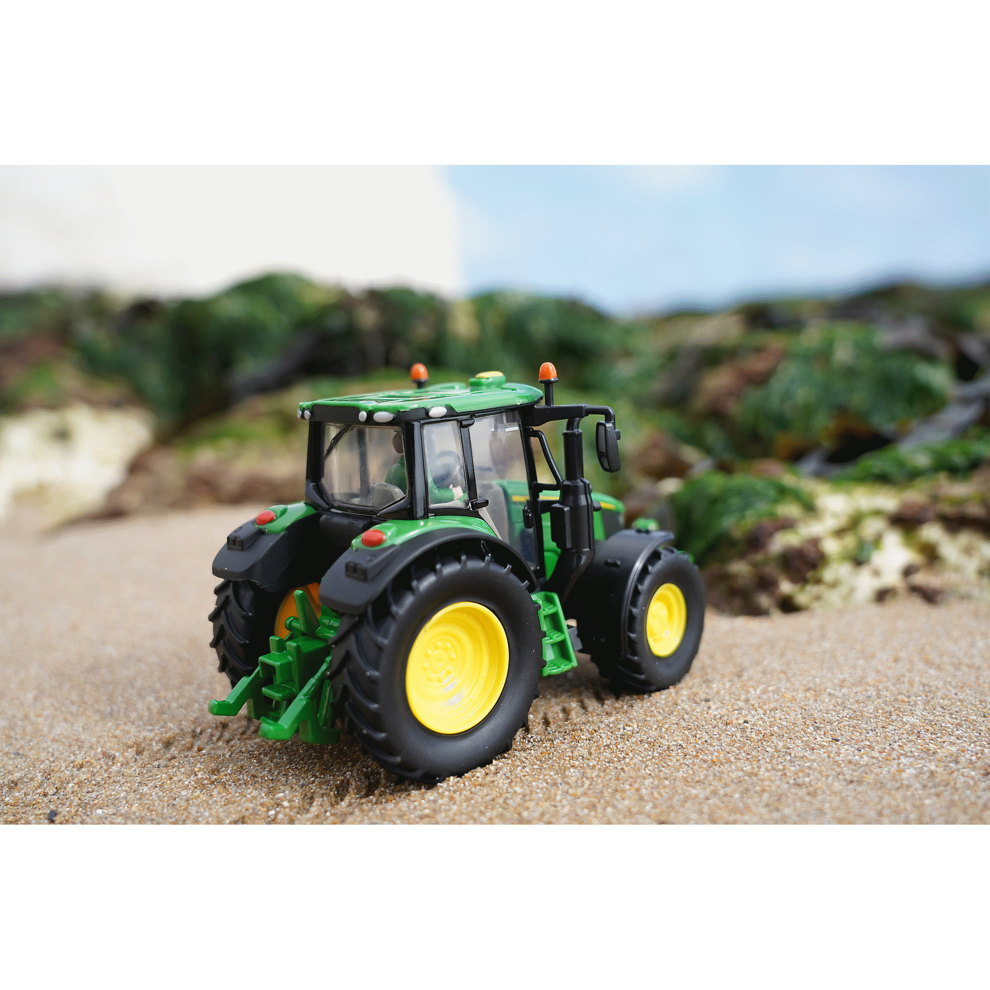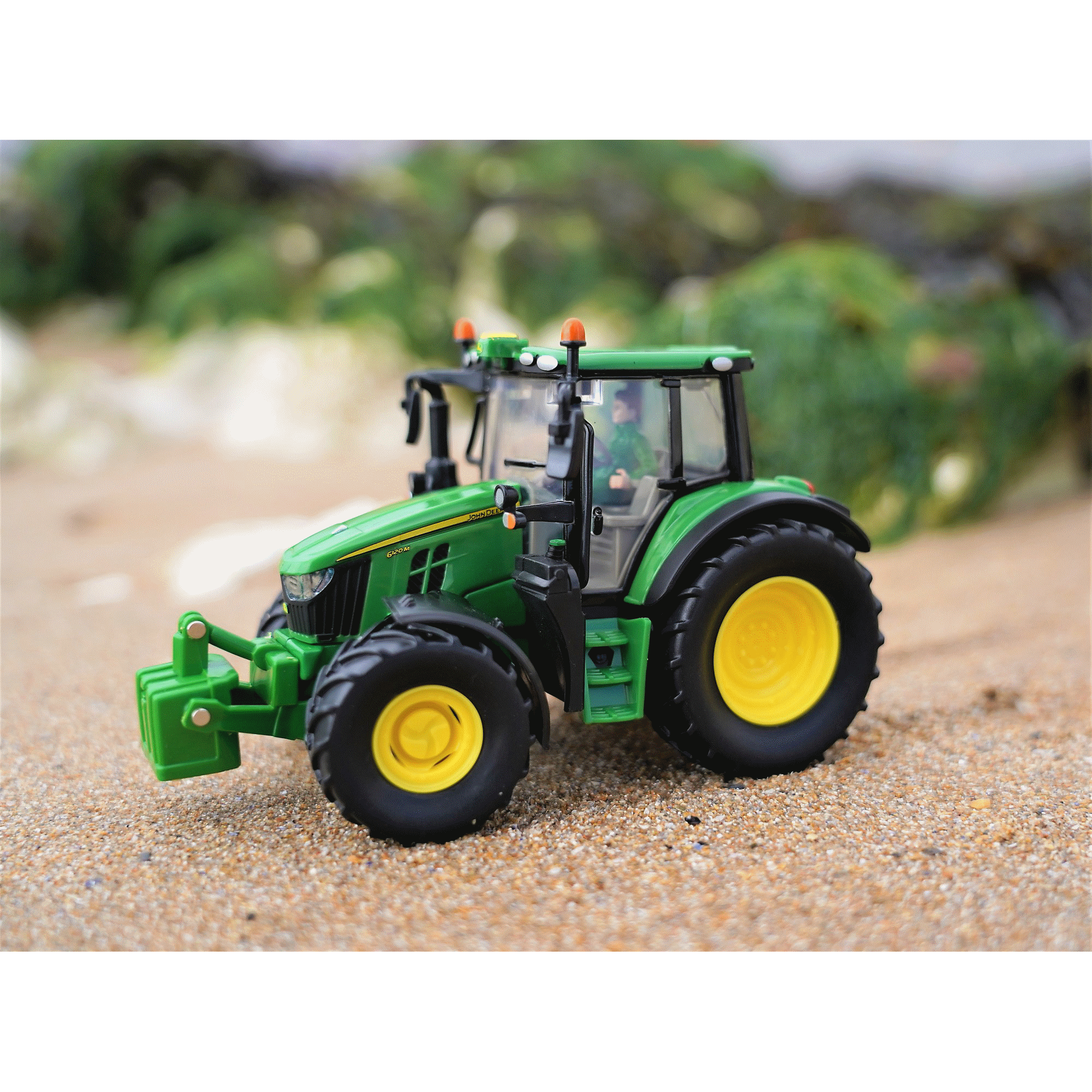 Selected from the new 6M series from John Deere, the 6120M has a brand new cab with ultimate visibility, strong engine performance with a John Deere 4.5 l engine, amazing total performance with strong hydraulics and the short wheelbase with their compact build, and with a best-in-class payload of 4.7 tons, they won’t break a sweat with heavy implements. The Britains model doesn’t stint on detail: removable cab where you can drop your sitting drivers (sold separately), working steering and an A-frame front hitch. It’s one of a range of 1:32 scale models built of die cast metal and plastic. Suitable for indoor and outdoor play, for kids and collectors aged 3+.